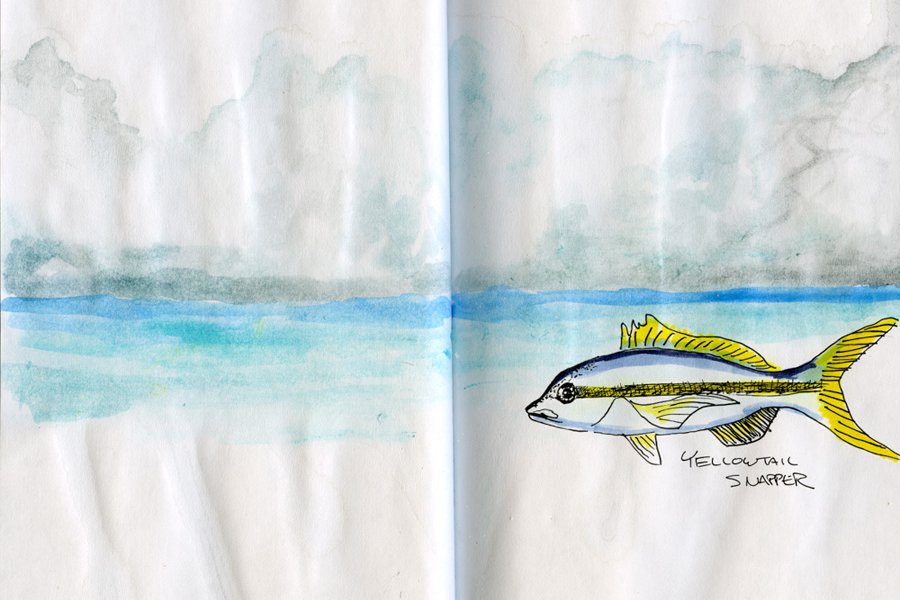 I try to sketch the fish of the Bahamas before and during my trips — it's a way to cement their fieldmarks in my mind. This is a sketch of the quite common Yellowtail Snapper.