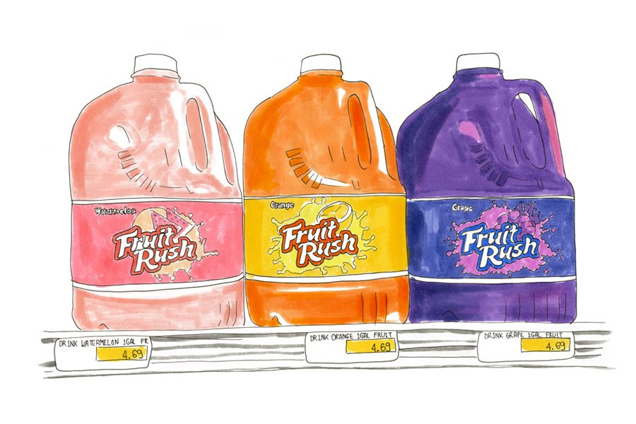 I loved the colors of these artificially-flavored fruit drinks in the local grocery stores.