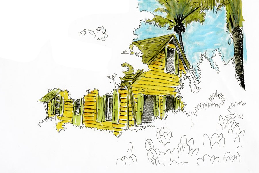 After I return from a trip, I do additional drawings based on reference photos. This is a typical loyalist home on Great Guana Cay, which recently lost its last remaining coppice and mangrove habitats to a large, unsustainable golf development.