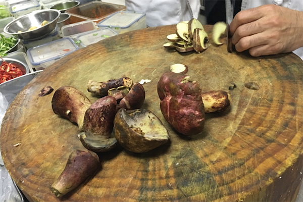 During mushroom season (July and August), Huang Jingkun, executive chef at Colorful Yunnan in Beijing, receives boxes of precious, rare mushrooms foraged by villagers in the forests of Yunnan. One day, he told me he was going to cook a very special mushroom for lunch. It was greenish purple. He had to change the cutting board and knife after prepping the mushrooms because they are extremely poisonous raw and any cross-contamination would cause food poisoning. (Every year in Yunnan, roughly 200 folks are hospitalized and at least 20 die from eating improperly cooked mushrooms.) He sautéed them with beautiful sweet green peppers and generous amount of garlic cloves and butter, and deglazed them with cognac and chicken stock. We ate it with a bowl of Yunnan short grain rice. It was heaven.
