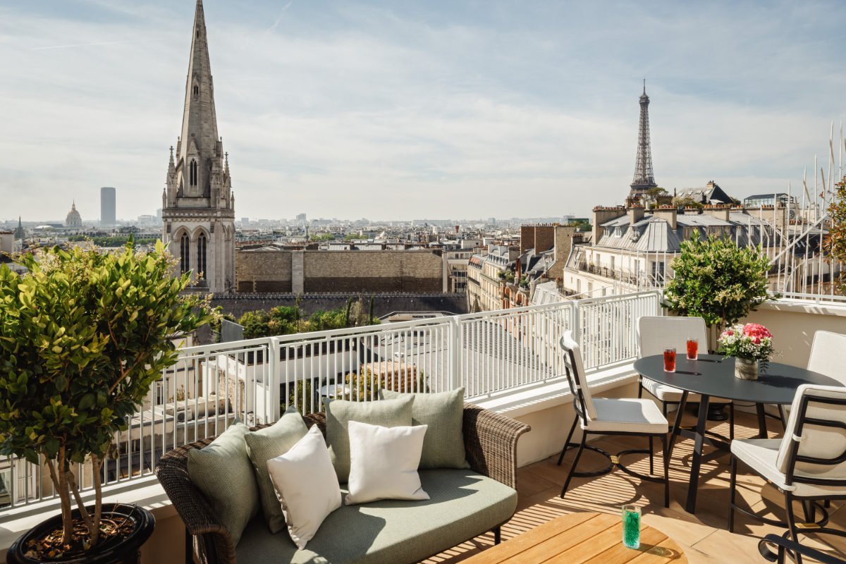 By the 1930s, the private residence had become the public Hôtel de Sers and was fully and carefully renovated earlier last year. With Art Deco accents across 43 rooms and nine suites, some with unobstructed views of the Iron Lady herself. Owner Agathe Jousse told me, “When we renovated, our vision was to imagine what a modern-day Marquis would create in his home. What makes it especially unique is the architecture of a private residence: The hotel is full of light, with floor-to-ceiling windows in many rooms and bathrooms and terraces in about half of our rooms.”