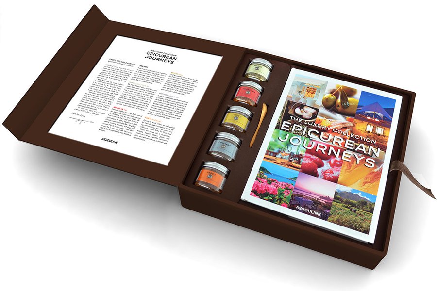 A world tour of the restaurants in The Luxuy Collection hotels around the world through chef recipes, photos, and stories from high-profile travelers. Included in the package is a Five Spices set created by spice master Lior Lev Sercarz of NYC's La Boîte à Epice, with special blends for every region in spice trade history.