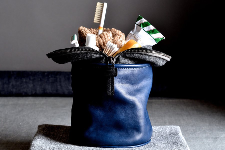 Although we'd never have thought of it, a vertical dopp kit not only makes sense (shampoo that stands upright won't leak) but also looks great (in handsome leather and Portuguese wool).