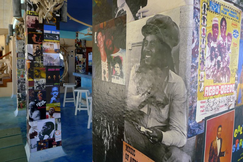 The pillars at Bar Bizot are covered with old record albums: Nina Simone, Jazzmatazz, Rolling Stones, and of course Bob Marley.