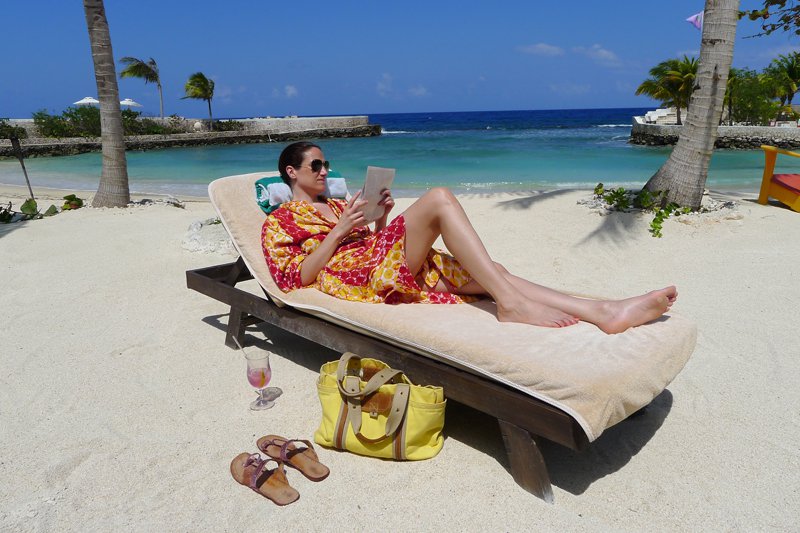 How I spent my days: reading with a Blackwell rum cocktail nearby. The bag is Hayden Harnett, the pink sandals cost $4 in Jaipur. The robe was theirs; I should have brought one home.