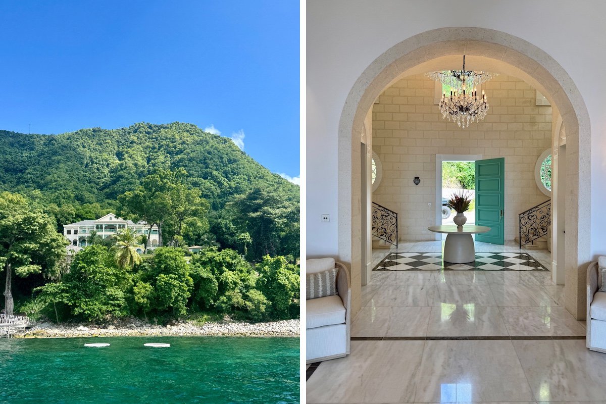 The estate comes with a private chef and full butler with staff to take care of your day-to-day needs, plus there’s a basketball court, a secluded and personal jetty, and a Range Rover on hand to whisk you away to any nearby island activities. After a 2023 restoration, the white marble interiors gleam and sparkle almost as much as the ocean, which you can see from the front entrance all the way to the horizon.